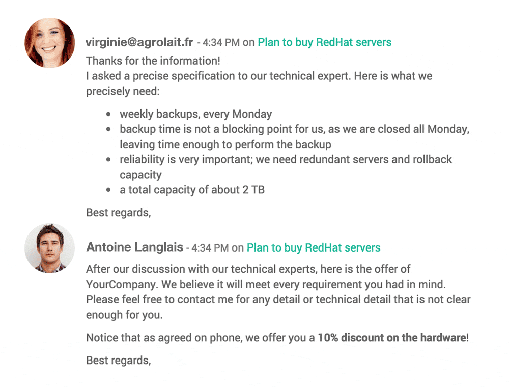 Recibe alertas personalizadas de actividades relevantes, comunícate por correo electrónico directamente desde las cotizaciones y mantén registros completos de tus negociaciones de manera automática.